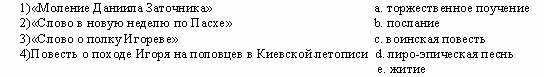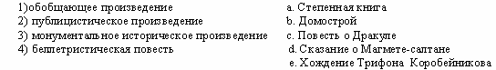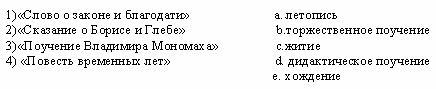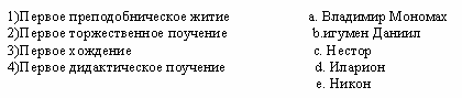 Список вопросов базы знанийИстория отечественной литературыВопрос id:1491989 Первым русским придворным поэтом был ?) Стефан Яворский ?) Карион Истомин ?) Симеон Полоцкий ?) Сильвестр Медведев Вопрос id:1491990 Переписка Ивана IV и Андрея Курбского относится к ___-м годам XVI века ?) 80 ?) 50 ?) 60-70 ?) 90 Вопрос id:1491991 По жанру, «Задонщина» ближе всего к ?) житию ?) сказанию ?) воинской повести ?) поучению Вопрос id:1491992 Повесть о Дракуле посвящена проблеме ?) облика самодержца ?) соотношения духовной и светской власти ?) феодальной раздробленности ?) взаимоотношений боярства и дворянства Вопрос id:1491993 Последним памятником Московского общерусского летописания была ___ летопись ?) Воскресенская ?) Никоновская ?) Лаврентьевская ?) Иоасафовская Вопрос id:1491994 Проблема судьбы молодого человека была в XVII в. центральной в ?) исторических повестях ?) житиях ?) бытовых повестях ?) сатирических повестях Вопрос id:1491995 Произведение Авраамия Палицына посвящено осаде___ монастыря ?) Киево-Печерского ?) Троице-Сергиева ?) Симонова ?) Андроникова Вопрос id:1491996 Произведения Симеона Полоцкого написаны в ___ системе стихосложения ?) тонической ?) молитвенной ?) силлабической ?) силлабо-тонической Вопрос id:1491997 Рукописная копия текста называется ?) протографом ?) редакцией ?) списком ?) изводом Вопрос id:1491998 Сборник Симеона Полоцкого «Рифмологион» заложил основу ___ поэзии ?) дидактической ?) героической ?) панегирической ?) любовной Вопрос id:1491999 Своеобразие «Повести об Азовском осадном сидении донских казаков» обусловлено необычным ?) образом повествователя ?) жанром ?) сюжетом ?) стилем Вопрос id:1492000 Собрание житий всех святых, известных на Руси, содержало ?) Стоглав ?) Четьи Минеи ?) Степенная книга ?) Никоновская летопись Вопрос id:1492001 Согласно гипотезе А.А. Шахматова, ___ - создатель “Повести временных лет” ?) Никон ?) Иоанн ?) Cильвестр ?) Нестор Вопрос id:1492002 Соотнесите произведение и автора: ![]() ?) 1с, 2d, 3b,4a ?) 1a, 2b, 3 c, 4d ?) 1b,2 d, 3 a, 4e ?) 1e, 2a, 3d,4c Вопрос id:1492003 Соотнесите произведения и жанры ![]() ?) 1c, 2 d, 3 e, 4 b ?) 1a, 2 e, 3 c, 4 d ?) 1d, 2 b, 3 a, 4 e ?) 1b, 2 a, 3d, 4 c Вопрос id:1492004 Соотнесите тип произведения и название ![]() ?) 1 a, 2 e, 3 d, 4 b ?) 1 e, 2 b, 3 c, 4 d, ?) 1b, 2 d, 3 a, 4 с ?) 1d, 2 c, 3 b, 4 a Вопрос id:1492005 Степенная книга была написана в ?) 1580-е гг. ?) конце XV в. ?) 1555 г. ?) 1560-е гг. Вопрос id:1492006 Теория «Москва - третий Рим» была впервые сформулирована ?) Филофеем ?) Максимом Греком ?) Иваном Пересветовым ?) Андреем Курбским Вопрос id:1492007 Тип «Жития Сергия Радонежского» - это ?) равноапостольское ?) святительское ?) мученическое ?) преподобническое Вопрос id:1492008 Тип «Хождения за три моря» - это ?) купеческое ?) посольское ?) землепроходческое ?) паломническое Вопрос id:1492009 Трифон Коробейников совершил в 1590-е гг. путешествие в(на) ?) Киев ?) Афон ?) Рим ?) Царьград Вопрос id:1492010 Установите правильную последовательность ранних летописных сводов: ?) Первый Киево-Печерский свод ?) Начальный свод ?) Повесть временных лет ?) Древнейший Киевский свод Вопрос id:1492011 Установите соответствие ![]() ?) 1c, 2b, 3a, 4e ?) 1d, 2a, 3 b, 4c ?) 1a, 2d, 3c,4b ?) 1b, 2c, 3d,4a Вопрос id:1492012 Фольклорный, по происхождению, сюжет в «Повести о разорении Рязани» - это ?) осада Рязани ?) плач Игоря ?) битва Евпатия ?) посольство Федора Вопрос id:1492013 Центральной проблемой в «Сказании о Магмете-салтане» является проблема ?) положения крестьянства ?) отношений царства и священства ?) идеального монарха ?) истинной веры Вопрос id:1492014 Школьная драма использовала ___ сюж