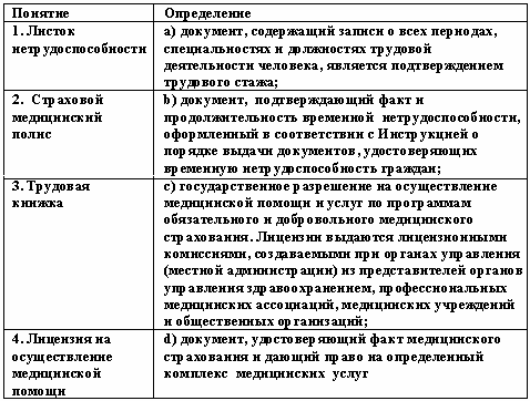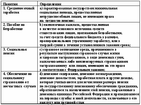 Список вопросов базы знанийПравовое обеспечение социальной работыВопрос id:1514177 Установите соответствие между видами выплат и их определениями ![]() ?) 1 - b, 2 - d, 3 - а ?) 1 - а, 2 - с, 3 - d ?) 1 - с, 2 - а, 3 - b ?) 1 - c, 2 - b, 3 - a Вопрос id:1514178 Установите соответствие между видами пенсий и их определениями ![]() ?) 1 - b, 2 - d, 3 - е 4 - а, 5 - с ?) 1 - а, 2 - е, 3 - d, 4 - с, 5 - b ?) 1 - е, 2 - с, 3 - b, 4 - d, 5 - а ?) 1 - d, 2 -а, 3 - с, 4 - b, 5 - е Вопрос id:1514179 Установите соответствие между видами платежей и их определениями ![]() ?) 1 - а, 2 - b, 3 - d, 4 - с ?) 1 - b, 2 - d, 3 - с, 4 - а ?) 1 - с, 2 - а, 3 - b, 4 - d ?) 1 - d, 2 - с, 3 - а, 4 - b Вопрос id:1514180 Установите соответствие между видами стажа и их определениями ![]() ?) 1 - d, 2 - с, 3 - а, 4 - b ?) 1 - а, 2 - b, 3 - d, 4 - с ?) 1 - с, 2 - а, 3 - b, 4 - d ?) 1 - b, 2 - d, 3 - с, 4 - а Вопрос id:1514181 Установите соответствие между документами и их определениями ![]() ?) 1 - с, 2 - а, 3 - d, 4 - b ?) 1 - а. 2 - b, 3 - с, 4 - d ?) 1 - d, 2 - с, 3 - b, 4 - а ?) 1 - b, 2 - d, 3 - а, 4 - с Вопрос id:1514182 Установите соответствие между категориями граждан и их определениями ![]() ?) 1 - b, 2 - d, 3 - а, 4 - с ?) 1 - с, 2 - а, 3 - d, 4 - b ?) 1 - а, 2 - b, 3 - d, 4 - с ?) 1 - d, 2 - с, 3 - b, 4 - а Вопрос id:1514183 Установите соответствие между понятиями и их определениями ![]() ?) 1 - а, 2 - d, 3 - b ?) 1 - с, 2 - d, 3 - b ?) 1 - a, 2 - с, 3 - b ?) 1 - а, 2 - b, 3 - с Вопрос id:1514184 Установите соответствие между понятиями и их определениями ![]() ?) 1 - а, 2 - с, 3 - b, 4 - d ?) 1 - с, 2 - d, 3 - а, 4 - b ?) 1 - d, 2 - b, 3 - а, 4 - с ?) 1 - b, 2 - а, 3 - d, 4 - с Вопрос id:1514185 Установите соответствие между понятиями и их определениями ![]() ?) 1 - с, 2 - е, 3 - f, 4 - b, 5 - d, 6 - а ?) 1 - b, 2 - с, 3 - а, 4 - е, 5 - f, 6 - d ?) 1 - а , 2 - b, 3 - d, 4 - f, 5 - е, 6 - с ?) 1 - е, 2 - а, 3 - b, 4 - d, 5 - с, 6 - f Вопрос id:1514186 Установите соответствие между понятиями стажа и их определениями ![]() ?) 1 - с, 2 - b, 3 - а, 4 - d ?) 1 - d, 2 - b, 3 - с, 4 - а ?) 1- а, 2 - с, 3 - d, 4 - b ?) 1 - b, 2 - а, 3 - d, 4 - с Вопрос id:1514187 Установите соответствие между частями пенсии и их определениями ![]() ?) 1 - а, 2 - b, 3 - с ?) 1 - с, 2 - d, 3 - а ?) 1 - d, 2 - а, 3 - b ?) 1 - b, 2 - с, 3 - d Вопрос id:1514190 Участники правоотношения связаны между собой правами и обязанностями ?) моральными ?) юридическими ?) материальными ?) экономическими Вопрос id:1514191 Федеральный закон «О потребительской корзине в целом по Российской Федерации» был принят в ?) 1999 г. ?) 2001 г. ?) 2002 г. ?) 2000 г. Вопрос id:1514192 Федеральный закон «О прожиточном минимуме в Российской Федерации» был принят в ?) 2001 г. ?) 1997 г. ?) 1998 г. ?) 1999 г. Вопрос id:1514193 Федеральный закон «Об общих принципах организации местного самоуправления в Российской Федерации» был принят в ?) 1997 г. ?) 1999 г. ?) 1998 г. ?) 1995 г. Вопрос id:1514194 Федеральный закон “О государственных пособиях гражданам, имеющим детей” был принят в ?) 1995 г. ?) 1999 г. ?) 1996 г. ?) 1998 г. Вопрос id:1514195 Финансирование приказов общественного призрения было возложено на ?) государственную казну ?) казну и местные органы власти ?) имущих жителей ?) местные органы власти Вопрос id:1514196 Финансовые средства фондов обязательного медицинского страхования находятся в собственности ?) частных лиц ?) регионов ?) государства ?) субъектов Федерации Вопрос id:1514197 Фонд государственного (обязательного) социального страхования финансирует в Чехии ?) пенсионное обеспечение ?) обеспечение по безработице ?) медицинское обслуживание ?) обеспечение пособиями по материнству Вопрос id:1514198 Фонд социального страхования Российской Федерации был образован в соответствии с постановлением ?) Политбюро ЦК КПСС ?) Совета Народных Комиссаров ?) Президиума Верховного Совета СССР ?) Совета Министров и Федерации независимых профсоюзов Вопрос id:1514199 Фонд социального страхования РФ был образ
