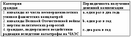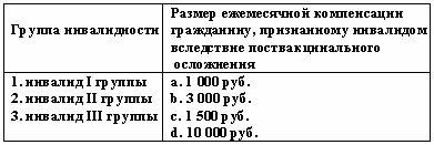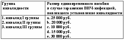 Список вопросов базы знанийПравовое обеспечение социальной работыВопрос id:1513775 Легковой автомобиль предоставляется в пользование бесплатно лицам, имеющим право на обеспечение транспортными средствами, один раз в ?) 15 лет ?) 7 лет ?) 10 лет ?) 5 лет Вопрос id:1513776 Лица, проживающие в стационарных учреждениях социального обслуживания, могут временно выбывать из учреждения по личным мотивам ?) с согласия остальных лиц, проживающих в стационарном учреждении ?) с согласия органа социальной защиты населения ?) по личному желанию ?) с согласия директора Вопрос id:1513777 Медико-социальные учреждения, предназначенные для постоянного проживания престарелых и инвалидов, нуждающихся в уходе, бытовом и медицинском обслуживании, - это ?) центры социальной адаптации ?) дома-интернаты ?) социальные приюты ?) социальные гостиницы Вопрос id:1513778 Медико-социальными учреждениями для постоянного проживания пенсионеров и инвалидов, страдающих хроническими психическими расстройствами и нуждающихся в уходе, бытовом и медицинском обслуживании, являются ?) социальные приюты ?) дома-интернаты ?) психоневрологические интернаты ?) социальные гостиницы Вопрос id:1513779 Международная организация труда (МОТ), созданная в целях международного сотрудничества и устранения социальной несправедливости, была образована в ?) 1991 г. ?) 1948 г. ?) 1919 г. ?) 1922 г. Вопрос id:1513780 Многодетным семьям предоставляется скидка по оплате коммунальных услуг в размере не менее ?) 20 % ?) 50 % ?) 35 % ?) 30% Вопрос id:1513781 Мотоколяска предоставляется гражданину, нуждающемуся в ней по медицинским показателям, в ?) пользование с последующим переходом в собственность ?) аренду ?) собственность ?) пользование Вопрос id:1513782 Мотоколяска предоставляется инвалидам один раз в ?) 5 лет ?) 3 года ?) 10 лет ?) год Вопрос id:1513783 Назначение и выплата пособия на погребение в настоящее время регулируется ?) Федеральным законом «О погребении и похоронном деле» от 12 января 1996 г. ?) Федеральным законом «О государственной социальной помощи» от 17 июля 1999 г. ?) Федеральным законом «Об основах обязательного социального страхования» от 16 июля 1998 г. ?) Федеральным законом «О государственном пенсионном обеспечении в РФ» от 15 декабря 2001 г. Вопрос id:1513784 Назначение и выплата социальных пенсий регулируется ?) Федеральным законом «О трудовых пенсиях в РФ» от 17 декабря 2001 г. ?) Федеральным законом «О социальной защите инвалидов» от 24 ноября 1995 г. ?) Федеральным законом «О государственном пенсионном обеспечении в РФ» от 15 декабря 2001 г. ?) Федеральным законом «Об обязательном пенсионном страховании в РФ» от 15 декабря 2001 г. Вопрос id:1513785 Некоторые категории граждан вместо путевок в санаторно-курортные организации имеют право на получение денежной компенсации, выплачиваемой с определенной периодичностью Установите соответствие: ![]() ?) 1-a, 2-a, 3-c, 4-c ?) 1-a, 2-b, 3-b, 4-b ?) 1-b, 2-a, 3-b, 4-b ?) 1-b, 2-c, 3-b, 4-c Вопрос id:1513786 Обязательное медицинское страхование неработающего населения осуществляется по месту жительства граждан ?) территориальным органом службы занятости ?) органами исполнительной власти ?) органами здравоохранения ?) территориальным органом Пенсионного фонда РФ Вопрос id:1513787 Оплата услуг по изготовлению протезно-ортопедических изделий, обучению обращения с протезами, ремонту протезов производится ?) Фондом обязательного медицинского страхования РФ ?) протезно-ортопедичес
