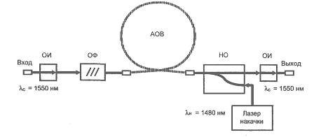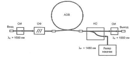 ?) оптический изолятор ?) основной указатель ?) обобщенный изолятор ?) оптический измеритель Вопрос id:1605067 В схеме оптического усилителя на примесном волокне на рисунке приведен оптический пассивный элемент – ОФ, обозначающий