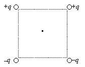 ?) не изменится ?) уменьшится ?) увеличится ?) при ε > 2 увеличится, при ε ≤ 2 уменьшится Вопрос id:1675020 Кулоновская сила F, действующая на отрицательный точечный заряд, помещенный в центр квадрата (рисунок), в углах которого находятся заряды: +q, +q, –q, –q, совпадает по направлению со стрелкой