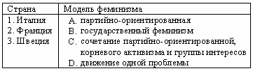 Список вопросов базы знанийПолитические и социальные движения Запада (курс 1)Вопрос id:1788396 Установите соответствие между страной и моделью феминизма. ![]() ?) 1-d, 2-a, 3-b ?) 2-b, 1-a, 3-a ?) 1-b, 2-c, 3-d ?) 1-a, 2-d, 3-c Вопрос id:1788397 Установите соответствие. ![]() ?) 1-c, 2-d, 3-a ?) 1-a, 2-c, 3-d ?) 1-b, 2-d, 3-a ?) 1-d, 2-c, 3-b Вопрос id:1788398 Утопизм современных движений протеста обеспечивает привлекательность этих движений в глазах широких масс и тем самым способствует росту их ?) влияния ?) численности ?) благосостояния ?) популярности Вопрос id:1788399 Участие молодежи в политической жизни общества представляет собой особую форму консолидации ее групповых интересов, отражающих осознанные особенности собственного положения ?) правового ?) политического ?) социального ?) экономического Вопрос id:1788400 Феномен "антиглобализма" - это ?) социальное движение ?) общественно-политическое движение ?) направление внешней политики ?) политическое движение Вопрос id:1788401 Филиалы (секции) Международной Амнистии имеются в более, чем ?) 30 странах ?) 40 странах ?) 20 странах Вопрос id:1788402 Формированию глобальной общности противников глобализации положило начало соглашение Мексики о вступлении в ?) МАГАТЕ ?) НАФТА ?) АСЕАН ?) ЮНИДО Вопрос id:1788403 Французские борцы за сохранение природы призывают перейти на синтетическую эссенцию и заменить ею натуральное масло парфюмеров компании ?) "Нина Ричи" ?) "Диор" ?) "Ив Сен Лоран" ?) "Шанель" Вопрос id:1788404 Хиппи были детьми ?) богатых родителей ?) родителей среднего класса ?) бедных родителей ?) сиротами Вопрос id:1788405 Целью женского освободительного движения является ?) равенство с мужчинами ?) адаптация женщины к мужским ценностям ?) разрушение политических институтов, созданных мужчинами ?) переоценка женской сути Вопрос id:1788406 «Красные скины» («старые»), как ответвление движения скинхедов в США, - это ?) дети богатых родителей, протестующие против общественной несправедливости ?) умеренные пацифисты, исповедующие ненасильственные методы протеста ?) неонацисты, организованные и экипированные по типу британских собратьев ?) фанатичные, активно действующие левые боевики-террористы Вопрос id:1788407 «Мировое зло», против которого направлено острие критики представителей умеренного крыла антиглобалистов, - это ?) финансовый капитал ?) транснациональные корпорации ?) нефтедобывающие компании ?) мировые информационные центры Вопрос id:1788408 Активные люди, которые на добровольной и безвозмездной основе оказывают посильную помощь Гринпис, - это… Вопрос id:1788409 Борьба женщин за гражданское право участия в голосовании - это ?) феминизм ?) неофеминизм ?) суфражизм ?) сексизм Вопрос id:1788410 Важное направление деятельности организации Международная амнистия - это прекращение внесудебных казней и так называемых ___ людей Вопрос id:1788411 Взаимоотношения международных неправительственных организаций и общественно-политических движений, осуществляемые не через взаимодействие между государствами, а непосредственно, с помощью механизмов прямого действия, - это элементы формирующегося глобального (ой) ?) правового поля ?) информационной сети ?) гражданского общества ?) экономического порядка Вопрос id:1788412 Вид искусства, с которого начинали панки в попытках создать свою собственную, ни на что не похожую суперкультуру, - это ?) кинематограф ?) музыка ?) живопись ?) театр Вопрос id:1788413 Виды массовой общественной самоорган