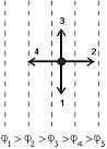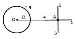?) А – 4 ?) А – 1 ?) А – 2 ?) А – 3 Вопрос id:1828259 Поле создано равномерно заряженной сферической поверхностью с зарядом +q. Укажите направление вектора градиента потенциала в точке А.