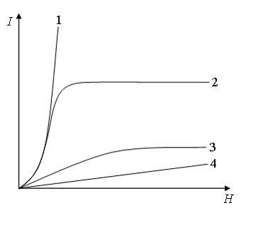 После замыкания ключа К позже всех остальных загорится лампа номер … ?) 1 ?) 2 ?) 3 Вопрос id:1828256 На рисунке представлены графики, отражающие характер зависимости величины намагниченности I вещества (по модулю) от напряженности магнитного поля Н.