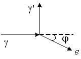 и электрона отдачи (e). Угол рассеяния 90°, направление движения электрона отдачи составляет с направлением падающего фотона угол