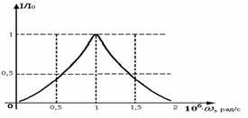 представлена зависимость относительной амплитуды колебаний силы тока в катушке индуктивностью 1мГн, включенной в колебательный контур. Емкость конденсатора этого контура равна