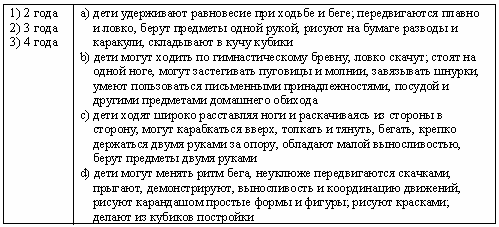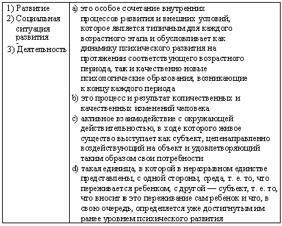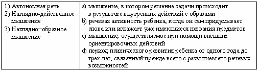Список вопросов базы знанийМетодическая работа в ДОУВопрос id:1896471 Непосредственное эмоциональное общение ребенка и матери - ведущая деятельность в ?) раннем возрасте ?) дошкольного возраста ?) период новорожденности ?) младенческом возрасте Вопрос id:1896472 О возможности преодоления познавательного «эгоцентризма» в игре говорил ?) С. Выготский ?) Дж. Брунер ?) Л. Ф. Обухова ?) Ж. Пиаже Вопрос id:1896473 О том, что возрастные изменения могут происходить резко, критически или постепенно, литически, пишет в книге «Очерк научной психологии» ?) А.Н. Леонтьев ?) П. П. Блонский ?) Л.С. Выготский ?) Л. И. Божович Вопрос id:1896474 Окружающая действительность, отражаемая ребенком, является в ролевой игре ?) содержанием ?) правилом ?) сюжетом ?) игровым действием Вопрос id:1896475 Определенная ступень развития индивида, для которой характерны закономерные физиологические и психологические изменения, связанные со становлением личности, особенностями ее деятельности, общения и воспитания, называется ?) перестройкой ?) созреванием ?) возрастом ?) ростом Вопрос id:1896476 Опыт соответствующих возрасту видов деятельности в форме психических образований, которые во внешнем плане представлены соответствующими обобщениями, а затем и универсальными способами действия; умение ребенка видеть общее в единичном явлении и находить, соответственно, необходимый способ решения новых задач своей деятельности входит в понятие ?) интеллектуальная компетентность ?) социальная компетентность ?) языковая компетентность ?) физическая компетентность Вопрос id:1896477 Освоение ребенком фиксированных в культуре способов употребления предметов представляет собой ?) учебная деятельность ?) ситуативно-личностная деятельность ?) предметно-манипулятивная деятельность ?) продуктивная деятельность Вопрос id:1896478 Особая эмоционально-двигательная реакция новорожденного ребенка по отношению к взрослому называется ?) деловым ощением ?) комплексом оживления ?) сотрудничеством ?) ходьбой Вопрос id:1896479 Особое сочетание внутренних процессов развития и внешних условий, которое является типичным для каждого возрастного этапа и обусловливает как динамику психического развития на протяжении соответствующего возрастного периода, так и качественно новые психологические образования, возникающие к концу каждого периода, называется ?) зоной актуального развития ?) психическим новообразованием ?) зоной ближайшего развития ?) социальной ситуацией развития Вопрос id:1896480 Особый, относительно непродолжительный по времени (до года) период онтогенеза, характеризующийся резкими психологическими изменениями, называется ?) онтогенез ?) филогенез ?) социогенез ?) кризис Вопрос id:1896481 Первым основным новообразованием младенческого возраста является ?) комплекс оживления ?) нагляднообразное мышление ?) ходьба и первые слова ?) функциональные действия Вопрос id:1896482 Период психического развития ребенка от одного года до трех лет, связанный прежде всего с развитием его речевых возможностей, называется ?) новорожденностью ?) ранним детством ?) дошкольным возрастом ?) младенчеством Вопрос id:1896483 Поведение, осуществляющееся в соответствии с образцом (независимо от того, дан ли он в форме действий другого человека или в форме уже выделившегося правила) и контролируемое путем сопоставления с этим образцом как эталоном, называется ?) пр