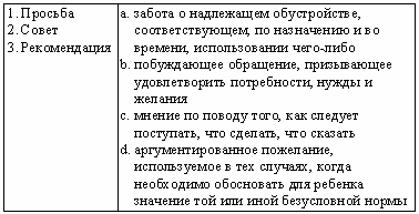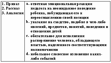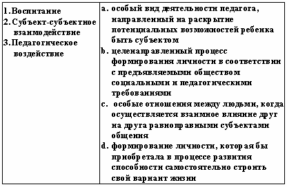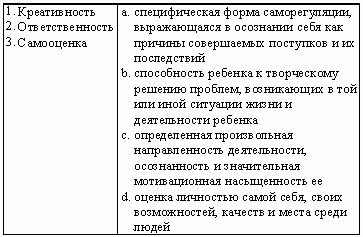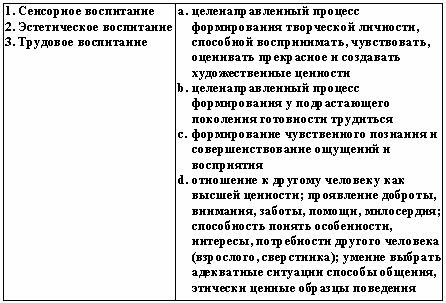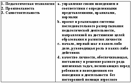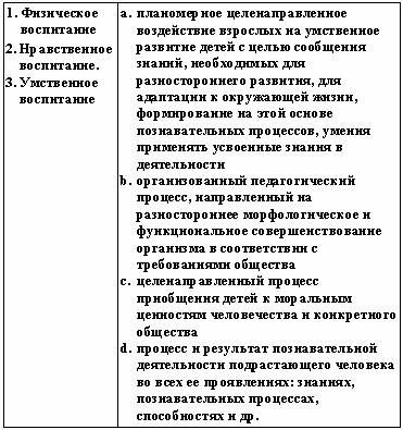 Список вопросов базы знанийОрганизация дошкольного образованияВопрос id:1966624 Тема/шкала: 1085.03.01;МТ.01;1 - Модульный тест - Организация дошкольного образования Установите соответствие между понятиями и их определениями. ![]() ?) 1 - d, 2 - b, 3 - c ?) 1 - a, 2 - c, 3 - a ?) 1 - c, 2 - d, 3 - b ?) 1 -b, 2 - а, 3 - d Вопрос id:1966625 Тема/шкала: 1085.03.01;МТ.01;1 - Модульный тест - Организация дошкольного образования Установите соответствие между понятиями и их определениями. ![]() ?) 1 - с, 2 - b , 3 - a ?) 1 - b, 2 - а, 3 - с ?) 1 - a, 2 - b, 3 - c ?) 1 - а, 2 - c, 3 - b Вопрос id:1966626 Тема/шкала: 1085.03.01;МТ.01;1 - Модульный тест - Организация дошкольного образования Установите соответствие между понятиями и их определениями. ![]() ?) 1 - c, 2 - a, 3 - d ?) 1 - d, 2 - b, 3 - c ?) 1 - b, 2 - c, 3 - a ?) 1 - a, 2 - b, 3 - c Вопрос id:1966627 Тема/шкала: 1085.03.01;МТ.01;1 - Модульный тест - Организация дошкольного образования Установите соответствие между понятиями и их определениями. ![]() ?) 1 - а, 2 - c, 3 - b ?) 1 - b, 2 - а, 3 - с ?) 1 - с, 2 - b , 3 - a ?) 1 - a, 2 - b, 3 - c Вопрос id:1966628 Тема/шкала: 1085.03.01;МТ.01;1 - Модульный тест - Организация дошкольного образования Установите соответствие между понятиями и их определениями. ![]() ?) 1 - b, 2 - a, 3 - d ?) 1 - c, 2 - d, 3 - a ?) 1 - a, 2 - b, 3 - c ?) 1 - d, 2 - c, 3 - b Вопрос id:1966629 Тема/шкала: 1085.03.01;МТ.01;1 - Модульный тест - Организация дошкольного образования Установите соответствие между понятиями и их определениями. ![]() ?) 1 - b, 2 - d, 3 - a ?) 1 - a, 2 - b, 3 - c ?) 1 - с, 2 - a, 3 - b ?) 1 - a, 2 - c, 3 - d Вопрос id:1966630 Тема/шкала: 1085.03.01;МТ.01;1 - Модульный тест - Организация дошкольного образования Установите соответствие между понятиями и их определениями. ![]() ?) 1 - b, 2 - c, 3 - a ?) 1 - a, 2 - b, 3 - c ?) 1 - c, 2 - a, 3 - d ?) 1- d, 2 - b, 3 - c Вопрос id:1966631 Тема/шкала: 1085.03.01;МТ.01;1 - Модульный тест - Организация дошкольного образования Установите соответствие между умениями и их содержанием. ![]() ?) 1 - b, 2 - c, 3 - a ?) 1 - a, 2 - b, 3 - c ?) 1 - d, 2 - b, 3 - c ?) 1 - c, 2 - a, 3 - d Вопрос id:1966632 Тема/шкала: 1085.03.01;МТ.01;1 - Модульный тест - Организация дошкольного образования Установите соответствие между формами трансляции педагогического требования и их содержанием. ![]() ?) 1 - a, 2 - b, 3 - a ?) 1 - b, 2 - c, 3 - d ?) 1 - c, 2 - d, 3 - b ?) 1 - d, 2 - a, 3 - c Вопрос id:1966633 Тема/шкала: 1085.03.01;МТ.01;1 - Модульный тест - Организация дошкольного образования Установите соответствие между формами трансляции педагогического требования и их содержанием. ![]() ?) 1 - a, 2 - b, 3 - c ?) 1 - d, 2 - b, 3 - c ?) 1 - c, 2 - a, 3 - d ?) 1 - b, 2 - c, 3 - d Вопрос id:1966634 Тема/шкала: 1085.03.01;МТ.01;1 - Модульный тест - Организация дошкольного образования Установите соответствие между формами трансляции педагогического требования и их содержанием. ![]() ?) 1 - c, 2 - d, 3 - b ?) 1 - a, 2 - e, 3 - a ?) 1 - b, 2 - c, 3 - d ?) 1 - e, 2 - a, 3 - c Вопрос id:1966635 Тема/шкала: 1085.03.01;МТ.01;1 - Модульный тест - Организация дошкольного образования Формирование личности, которая бы приобретала в процессе развития способности самостоятельно строить свой вариант жизни, является целью ?) поощрения ?) наказания ?) воспитания ?) развития Вопрос id:1966636 Тема/шкала: 1085.03.01;МТ.01;1 - Модульный тест - Организация дошкольного образования Формирование чувственного познания и совершенствование ощущений и восприятия называется ___ воспитанием ?) трудовым ?) нравственным ?) сенсорным ?) физическим Вопрос id:1966637 Тема/шкала: 1085.03.01;МТ.01;1 - Модульный тест - Организация дошкольного образования Целенаправленный процесс приобщения детей к моральным ценностям человечества и конкретного общества называется ___ воспитанием ?) нравственным ?) сенсорным ?) умственным ?) физическим Вопрос id:1966638 Тема/шкала: 1085.03.01;МТ.01;1 - 