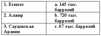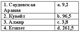 Список вопросов базы знанийЭкономика арабских странВопрос id:2019515 Тема/шкала: 1025.01.01;МТ.01;1 - Модульный тест - Экономика арабских стран Текстильная промышленность в Египте ?) сравнительно молодая отрасль экономики ?) появилась в стране лишь в 80-е годы ХХ в. ?) не развивается с 1952 г. ?) старейшая отрасль экономики Вопрос id:2019516 Тема/шкала: 1025.01.01;МТ.01;1 - Модульный тест - Экономика арабских стран Текстильные фабрики Египта сосредоточены в основном в главном районе хлопководства ?) Александрия ?) Нижний Египет ?) Верхний Египет ?) Порт-Саид Вопрос id:2019517 Тема/шкала: 1025.01.01;МТ.01;1 - Модульный тест - Экономика арабских стран Традиционное занятие прибрежных районов - рыболовство, являющееся одним из главных источников валютных поступлений ?) Сирии ?) Йемена ?) Ирака ?) Ливии и Ирака Вопрос id:2019518 Тема/шкала: 1025.01.01;МТ.01;1 - Модульный тест - Экономика арабских стран Тунисское оливковое масло высоко ценится на мировом рынке за ?) высокую кислотность ?) низкую стоимость и высокую кислотность ?) высокую кислотность, густую консистенцию и низкую стоимость ?) высокое качество и низкую кислотность Вопрос id:2019519 Тема/шкала: 1025.01.01;МТ.01;1 - Модульный тест - Экономика арабских стран Удельный вес госсектора в обрабатывающей промышленности Сирии оценочно составляет (в %) ?) 60 ?) 5-10 ?) 37-40 ?) 15 Вопрос id:2019520 Тема/шкала: 1025.01.01;МТ.01;1 - Модульный тест - Экономика арабских стран Удельный вес добычи нефти в совокупном объеме производства добывающей промышленности составляет в Сирии (в %) ?) 25 ?) 97 ?) 30 ?) 10-15 Вопрос id:2019521 Тема/шкала: 1025.01.01;МТ.01;1 - Модульный тест - Экономика арабских стран Установите соответствие между арабскими странами и ВВП на душу населения в 1995 г. ![]() ?) 1 - b, 2 - c, 3 - a ?) 1 - а, 2 - с, 3 - b ?) 1 - b, 2 - a, 3 - c ?) 1 - a, 2 - b, 3 - c Вопрос id:2019522 Тема/шкала: 1025.01.01;МТ.01;1 - Модульный тест - Экономика арабских стран Установите соответствие между арабскими странами и ежедневным объемом произведенного сжиженного газа в 1997 г. ![]() ?) 1 - b, 2 - a, 3 - c ?) 1 - d, 2 - c, 3 - a ?) 1 - с, 2 - a, 3 - b ?) 1 - a, 2 - b, 3 - c Вопрос id:2019523 Тема/шкала: 1025.01.01;МТ.01;1 - Модульный тест - Экономика арабских стран Установите соответствие между арабскими странами и запаами нефти (в млрд. баррелей) в конце 1997 г. ![]() ?) 1 - a, 2 - c, 3 - b, 4 - d ?) 1 - c, 2 - a, 3 - d, 4 - b ?) 1 - a, 2 - c, 3 - d, 4 - b ?) 1 - d, 2 - b, 3 - a, 4 - c Вопрос id:2019524 Тема/шкала: 1025.01.01;МТ.01;1 - Модульный тест - Экономика арабских стран Феллах по-арабски означает ?) рабочий на промышленном предприятии ?) работодатель ?) владелец крупного магазина ?) крестьянин Вопрос id:2019525 Тема/шкала: 1025.01.01;МТ.01;1 - Модульный тест - Экономика арабских стран Хелуанский металлургический комбинат - крупнейшее предприятие металлургической промышленности ?) Судана ?) Египта ?) Джибути ?) Сомали Вопрос id:2019526 Тема/шкала: 1025.01.01;МТ.01;1 - Модульный тест - Экономика арабских стран Химическая и нефтехимическая промышленности в Сирии ?) играют все возрастающую роль в хозяйственной жизни страны ?) отсутствуют ?) перестали существовать в конце 90-х годов ХХ в. ?) находятся в состоянии упадка и не играют никакой роли в хозяйственной жизни страны Вопрос id:2019527 Тема/шкала: 1025.01.01;МТ.01;1 - Модульный тест - Экономика арабских стран Центр Лиги арабских государств расположен в ?) Хартуме ?) Каире ?) Сане ?) Манаме Вопрос id:2019528 Тема/шкала: 1025.01.01;МТ.01;1 - Модульный тест - Экономика арабских стран Частный сектор в Египте представлен в основном предприятиями промышленности ?) пищевой, швейной, мебельной, кожевенно-об