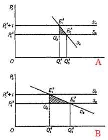 ?) эластичность спроса на товары А и В не отличается ?) спрос на товар А эластичнее, чем на В ?) сравнить эластичность спроса на два товара по рисунку невозможно ?) спрос на товар В эластичнее, чем на А Вопрос id:2021891 Тема/шкала: 4337.03.01;МТ.01;1 - Модульный тест - Экономика общественного сектора На графике представлено избыточное налоговое бремя