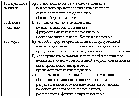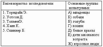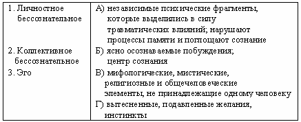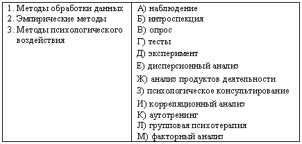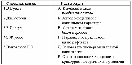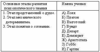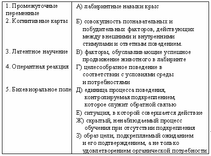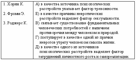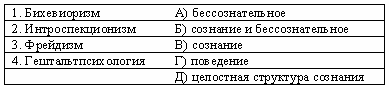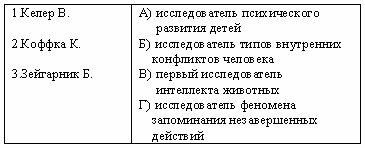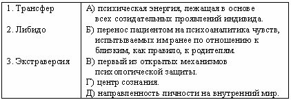 Список вопросов базы знанийПсихология (курс 7)Вопрос id:2040303 Тема/шкала: 1179.01.01;МТ.01;1 - Модульный тест - Психология (курс 3) Представителями гуманистической психологии являются ?) Оллпорт, Роджерс, Маслоу ?) Брунер, Айзенк, Фестингер ?) Александер, Осгуд, Спирмен ?) Абрахам, Линдсей, Найссер Вопрос id:2040304 Тема/шкала: 1179.01.01;МТ.01;1 - Модульный тест - Психология (курс 3) Представителями неофрейдизма являются: 1) Лакан Ж.; 2) Хорни К.; 3) Найссер У.; 4) Адлер А.; 5) Юнг К.; 6) Фромм Э. ?) 4, 5 ?) 1, 2, 3 ?) 1, 2, 6 ?) 1, 2, 3, 4 Вопрос id:2040305 Тема/шкала: 1179.01.01;МТ.01;1 - Модульный тест - Психология (курс 3) Процессы ассоциаций в терминологии психологии поведения были обозначены как ?) поведение ?) реакции ?) научение ?) обуславливание Вопрос id:2040306 Тема/шкала: 1179.01.01;МТ.01;1 - Модульный тест - Психология (курс 3) Психоаналитический метод свободных ассоциаций вслед за З. Фрейдом разрабатывался и был модифицирован ?) К. Юнгом ?) А. Адлером ?) В. Райхом ?) О. Ранком Вопрос id:2040307 Тема/шкала: 1179.01.01;МТ.01;1 - Модульный тест - Психология (курс 3) Психология и социология пользуются общим методом сбора первичных данных - … ?) историческим методом ?) тестированием ?) экспериментом ?) опросом Вопрос id:2040308 Тема/шкала: 1179.01.01;МТ.01;1 - Модульный тест - Психология (курс 3) Психология и философия сотрудничают в области ?) этимологии ?) эпистемологии ?) этологии ?) антропологии Вопрос id:2040309 Тема/шкала: 1179.01.01;МТ.01;1 - Модульный тест - Психология (курс 3) Работа З. Фрейда по изучению психологических защит в дальнейшем была продолжена ?) К. Юнгом ?) А. Адлером ?) Ж. Лаканом ?) А. Фрейд Вопрос id:2040310 Тема/шкала: 1179.01.01;МТ.01;1 - Модульный тест - Психология (курс 3) Разработка идей программированного обучения Скиннером осуществлялась на основе выделения единицы процесса поведения - ?) оперантной реакции ?) познавательной реакции ?) эмоциональной реакции ?) физиологической реакции Вопрос id:2040311 Тема/шкала: 1179.01.01;МТ.01;1 - Модульный тест - Психология (курс 3) Самыми первыми пациентами З. Фрейда были больные с ?) неврозом навязчивостей ?) шизофренией ?) истерией ?) фобическим неврозом Вопрос id:2040312 Тема/шкала: 1179.01.01;МТ.01;1 - Модульный тест - Психология (курс 3) Социальный характер, по Э. Фромму - это … характера у типичных представителей данного общества и культуры ?) внешние особенности ?) внутренняя структура ?) общие свойства ?) индивидуальные свойства Вопрос id:2040313 Тема/шкала: 1179.01.01;МТ.01;1 - Модульный тест - Психология (курс 3) Структурная модель строения психики З. Фрейда включает наличие ?) единой системы ?) 3-х систем ?) 4-х систем ?) 2-х систем Вопрос id:2040314 Тема/шкала: 1179.01.01;МТ.01;1 - Модульный тест - Психология (курс 3) Теорию мотивации и личности А. Маслоу называют ?) психосинтетической ?) психоаналитической ?) аналитической ?) социоаналитической Вопрос id:2040315 Тема/шкала: 1179.01.01;МТ.01;1 - Модульный тест - Психология (курс 3) Термин «групповая психотерапия» предложил в 1932 году ?) А. Пэйвио ?) Я. Морено ?) Н. Хомски ?) А. Бандура Вопрос id:2040316 Тема/шкала: 1179.01.01;МТ.01;1 - Модульный тест - Психология (курс 3) Термин «психология» стал известен благодаря научной деятельности ?) Меланхтона ?) В.Вундта ?) Гоклениуса ?) Х.Вольфа Вопрос id:2040317 Тема/шкала: 1179.01.01;МТ.01;1 - Модульный тест - Психология (курс 3) Толмен Э. рассматривал поведение как целостный процесс и свое учение, в противовес бихевиоризму Уотсона, называл ?) атомистическим ?) молярным ?) молекулярным ?) холистическим Вопрос id:2040318 Тема/шкала: 1179.01.01;МТ.01;1 - Модульн
