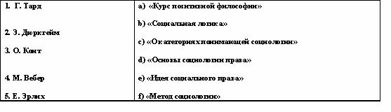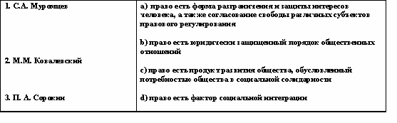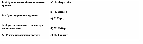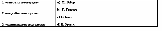 Список вопросов базы знанийСоциология права (курс 1)Вопрос id:2126130 Тема/шкала: 2684.01.01;МТ.01;1 - Модульный тест - Социология права (курс 1) Теория общества как функциональная коммуникативная система включает следующие элементы: 1) общество есть дифференцированное единство различных функциональных подсистем (экономической, правовой и т.д.); 2) правовая подсистема есть основа едннства общества; 3) каждая подсистема имеет бинарный код (код юридической системы - «законное/незаконное»); 4) каждая подсистема имеет программу, которая может изменяться в процессе приспособления к общественным переменам ?) 1, 3 ?) 2, 3, 4 ?) 1, 3, 4 ?) 1, 2, 3 Вопрос id:2126135 Тема/шкала: 2684.01.01;МТ.01;1 - Модульный тест - Социология права (курс 1) Тремя основными типами правопонимания являются: 1) естественно-правовой, 2) легистский, 3) позитивистский, 4) либертарный ?) 1, 3, 4 ?) 1, 2, 4 ?) 2, 3, 4 ?) 1, 2, 3 Вопрос id:2126138 Тема/шкала: 2684.01.01;МТ.01;1 - Модульный тест - Социология права (курс 1) Установите соответствие ![]() ?) 1-b, 2-c, 3-a, 4-d, 5-f ?) 1-b, 2-f, 3-a, 4-c, 5-d ?) 1-a, 2-f, 3-d, 4-e, 5-c ?) 1-b, 2-f, 3-a, 4-c, 5-e Вопрос id:2126139 Тема/шкала: 2684.01.01;МТ.01;1 - Модульный тест - Социология права (курс 1) Установите соответствие ![]() ?) 1 - c, 2 - d, 3 - a. ?) 1 - b, 2 - c, 3 - d. ?) 1 - b, 2 - a, 3 - c. ?) 1 - d, 2 - a, 3 - b. Вопрос id:2126140 Тема/шкала: 2684.01.01;МТ.01;1 - Модульный тест - Социология права (курс 1) Установите соответствие ![]() ?) 1 - с, 2 - a, 3 - b. ?) 1 - d, 2 - c, 3 - a. ?) 1 - b, 2 - a, 3 - d. ?) 1 - a, 2 - c, 3 - b. Вопрос id:2126141 Тема/шкала: 2684.01.01;МТ.01;1 - Модульный тест - Социология права (курс 1) Установите соответствие ![]() ?) 1 - d, 2 - a, 3 - c. ?) 1 - c, 2 - a, 3 - d. ?) 1 - c, 2 - a, 3 - b. ?) 1 - d, 2 - a, 3 - b. Вопрос id:2126142 Тема/шкала: 2684.01.01;МТ.01;1 - Модульный тест - Социология права (курс 1) Установите соответствие авторов и их идей ![]() ?) 1 - b, 2 - c, 3 - a. ?) 1 - d, 2 - b, 3 - a. ?) 1 - b, 2 - d, 3 - c. ?) 1 - a, 2 - c, 3 - b. Вопрос id:2126143 Тема/шкала: 2684.01.01;МТ.01;1 - Модульный тест - Социология права (курс 1) Установите соответствие авторства выражений ![]() ?) 1 - d; 2 - b; 3 - a. ?) 1 - c; 2 - b; 3 - d. ?) 1 - d; 2 - a; 3 - c. ?) 1 - a; 2 - b; 3 - d. Вопрос id:2126144 Тема/шкала: 2684.01.01;МТ.01;1 - Модульный тест - Социология права (курс 1) Установите соответствие имен ученых и предлагаемой ими сущности права ![]() ?) 1 - d, 2 - b, 3 - a. ?) 1 - b, 2 - c, 3 - a. ?) 1 - b, 2 - a, 3 - c. ?) 1 - b, 2 - d, 3 - c. Вопрос id:2126145 Тема/шкала: 2684.01.01;МТ.01;1 - Модульный тест - Социология права (курс 1) Установите соответствие названий научных трудов и их авторов ![]() ?) 1 - b, 2 - c, 3 - d, 4 - e. ?) 1 - a, 2 - b, 3 - e, 4 - c. ?) 1 - a, 2 - c, 3 - d, 4 - e. ?) 1 -a, 2 - c, 3 - b, 4 - d. Вопрос id:2126146 Тема/шкала: 2684.01.01;МТ.01;1 - Модульный тест - Социология права (курс 1) Ученые, рассматривающие право не как продукт государства, а как результат жизнедеятельности общества: 1) Ж. Гурвич; 2) Р. Паунд; 3) Е. Эрлих; 4) М. Вебер; 5) Т. Парсонс ?) 1, 2, 5 ?) 2, 3, 4 ?) 1, 3, 4 ?) 3, 4, 5 Вопрос id:2126147 Тема/шкала: 2684.01.01;МТ.01;1 - Модульный тест - Социология права (курс 1) Ученый социолог, видевший именно в религии основной движущий фактор общественного развития ?) М. Вебер ?) Т. Парсонс ?) Г. Тард ?) Е. Эрлих Вопрос id:2126148 Тема/шкала: 2684.01.01;МТ.01;1 - Модульный тест - Социология права (курс 1) Ученый, высказавший идею о целесообразности дополнения уголовного права его прямой противоположностью-«наградным правом» ?) Т. Парсонс ?) Р. Паунд ?) Ж. Гурвич ?) П. А. Сорокин Вопрос id:2126149 Тема/шкала: 2684.01.01;МТ.01;1 - Модульный тест - Социология права (курс 1) Ученый, одним из первых начавший изучение психологических аспектов формирования и действия права ?) М.М. Ковалевский ?) Л.И. Петражицкий ?) Н. Кондратьев ?) Н.М. Коркунов Вопрос id:2126150 Тема/шкала: 2684.01.01;МТ.01;1 - Модульный тест - Социоло
