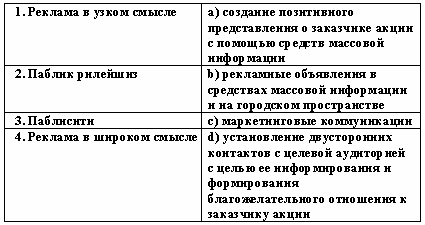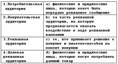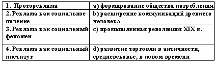 Список вопросов базы знанийСоциология рекламы (курс 1)Вопрос id:2147523 Тема/шкала: 1115.01.01;МТ.01;1 - Модульный тест - Социология рекламы Первое рекламное агентство «полного цикла» появилось в (во) ?) в Англии в 1856 г. ?) в США в 1931 г. ?) в США в 1891 г. ?) во Франции в 1812 г. Вопрос id:2147524 Тема/шкала: 1115.01.01;МТ.01;1 - Модульный тест - Социология рекламы Первые организации, основной функцией которых было составление и размещение рекламных объявлений по заказу рекламодателя, появились в ?) ХVIII в. ?) ХVII в. ?) ХIХ в. ?) ХХ в. Вопрос id:2147526 Тема/шкала: 1115.01.01;МТ.01;1 - Модульный тест - Социология рекламы Первый рекламный плакат рекламировал ?) книгу «Геометрия» Эвклида ?) книгу «Прекрасная Мелузина» ?) кофе ?) карижское кабаре Вопрос id:2147527 Тема/шкала: 1115.01.01;МТ.01;1 - Модульный тест - Социология рекламы Первый рекламный фильм был снят в ?) 1920 г. ?) 1949 г. ?) 1955 г. ?) 1898 г. Вопрос id:2147529 Тема/шкала: 1115.01.01;МТ.01;1 - Модульный тест - Социология рекламы Понятие «код стэндинга» ввел в социологию ?) Ж.Бодрийяр ?) Э.Гидденс ?) Т.Веблен ?) Г.Блумер Вопрос id:2147531 Тема/шкала: 1115.01.01;МТ.01;1 - Модульный тест - Социология рекламы Поступления от размещения рекламы стали системообразующим элементом функционирования СМИ в ?) в конце XIX в. ?) в середине ХХ в. ?) в начале XIX в. ?) в XVIII в. Вопрос id:2147533 Тема/шкала: 1115.01.01;МТ.01;1 - Модульный тест - Социология рекламы Появление сетевых рекламных агентств является следствием: 1) глобализации рынка; 2) урбанизации; 3) коммодификации различных областей социальной практики; 4) повышения уровня жизни населения ?) 1,2,3,4 ?) 1,2,3 ?) 3 ?) 1 Вопрос id:2147535 Тема/шкала: 1115.01.01;МТ.01;1 - Модульный тест - Социология рекламы Причинами появления «общества потребления» являются: 1) рост доходов населения в ХХ в. в связи с ростом производительности труда; 2) сокращение продолжительности рабочего дня и рост свободного времени; 3) урбанизация; 4) коммодификация различных сфер жизни ?) 3,4,5 ?) 1,2, 3,4,5 ?) 1,3,4 ?) 1,2,3 Вопрос id:2147536 Тема/шкала: 1115.01.01;МТ.01;1 - Модульный тест - Социология рекламы Протореклама возникла ?) в «темные» века ?) в средние века ?) в античности ?) в позднем палеолите Вопрос id:2147537 Тема/шкала: 1115.01.01;МТ.01;1 - Модульный тест - Социология рекламы Разработка рекламных сообщений применительно к национальным стереотипам разных государств входит в понятие ?) локальный маркетинг ?) глобальный маркетинг ?) коммерческий маркетинг ?) некоммерческий маркетинг Вопрос id:2147538 Тема/шкала: 1115.01.01;МТ.01;1 - Модульный тест - Социология рекламы Реклама ?) является самым старым каналом формирования общественного сознания ?) является единственным каналом формирования общественного сознания ?) является одним из каналов формирования общественного сознания ?) не является каналом формирования общественного сознания Вопрос id:2147539 Тема/шкала: 1115.01.01;МТ.01;1 - Модульный тест - Социология рекламы Реклама в условиях массового общества: 1) формирует единые стандарты потребления благ и услуг; 2) формирует единую культуру потребления; 3) формирует модель усредненного образа жизни социализированного члена общества; 4) в достаточной степени гарантирует сходное поведение типовых аудиторий в типовых ситуациях ?) 2,3,4 ?) 1,3, 4 ?) 1,2,3,4 ?) 1,2,3 Вопрос id:2147540 Тема/шкала: 1115.01.01;МТ.01;1 - Модульный тест - Социология рекламы Реклама влияет на экономическое развитие через: 1) ускорение сбыта; 2) обострение конкуренции; 3) формирование компетентного потребителя; 4) обеспечение массового сбыта; 5) ф