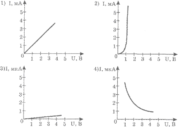 ?) → ?) ↓ ?) ↑ ?) ← Вопрос id:2184439 Тема/шкала: 7004.02.02;Т-Т.01;1 - Тест-тренинг - Физика (школьное обучение) Указать, какой из графиков, представленных на рисунке, соответствует вольт-амперной характеристике полупроводникового диода, включенного в прямом направлении