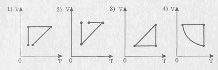 ?) 3 ?) 4 ?) 2 ?) 1 Вопрос id:2184577 Тема/шкала: 7004.06.02;Т-Т.01;1 - Тест-тренинг - Физика (школьное обучение) Идеальный газ сначала нагревался при постоянном давлении, потом его давление уменьшалось при постоянном объеме, затем при постоянной температуре объем газа уменьшился до первоначального значения. Этим изменениям состояния газа из графиков в координатных осях V - Т соответствует