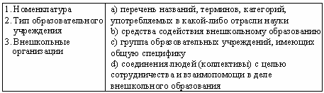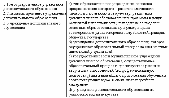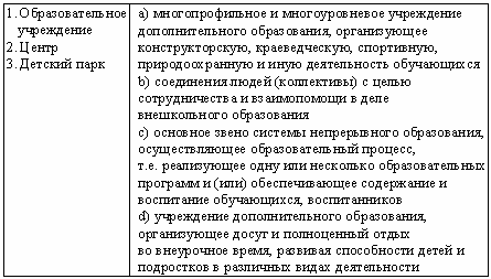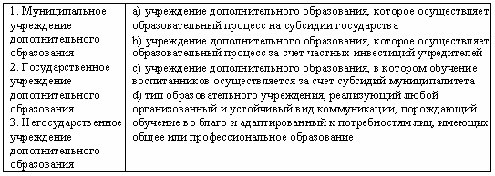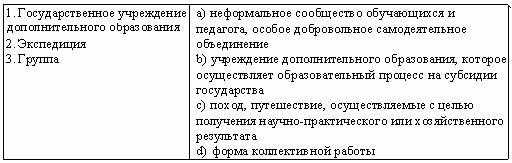 Список вопросов базы знанийТеория и практика современного дополнительного образованияВопрос id:2228630 Тема/шкала: 1083.02.01;МТ.01;1 - Модульный тест - Теория и практика современного дополнительного образования Профессиональное объединение педагогов - это группа работников, созданная с целью ?) решения отдельных проблем ?) решения отдельных задач ?) выполнения отдельных заданий ?) совместного решения сложных задач Вопрос id:2228631 Тема/шкала: 1083.02.01;МТ.01;1 - Модульный тест - Теория и практика современного дополнительного образования Профессиональное творчество - это ?) нахождение новых подходов к решению профессиональных задач, анализ профессиональных ситуация ?) нахождение новых нестандартных способов решения профессиональных задач, анализ профессиональных ситуаций, принятие профессиональных решений ?) нахождение нетрадиционных способов выхода из ситуации, анализ профессиональных ситуаций ?) нахождение творческих решений ситуаций, новых нестандартных способов решения Вопрос id:2228632 Тема/шкала: 1083.02.01;МТ.01;1 - Модульный тест - Теория и практика современного дополнительного образования Профессиональное творчество педагога дополнительного образования чаще всего опирается на ?) профессиональное мастерство ?) творческий подход к профессии ?) компетентность ?) свободное владение знаниями Вопрос id:2228633 Тема/шкала: 1083.02.01;МТ.01;1 - Модульный тест - Теория и практика современного дополнительного образования Результатами деятельности клуба можно считать наличие у обучающихся ?) знаний, умений, активности, рефлексии, самовоспитания, приемов ?) приемов мышления, актуальности поведения, значимости знаний, понимания рефлексии, готовности к деятельности, приемов ?) возможностей, готовности, деятельности, культуры, знаний, анализа ?) способов, приемов, техник мышления, деятельности, культуры рефлексии, поведения Вопрос id:2228634 Тема/шкала: 1083.02.01;МТ.01;1 - Модульный тест - Теория и практика современного дополнительного образования Результатом работы творческих мастерских являются такие виды продукции, как ?) методические сборники; учебно-методические пособия; положения о творческих конкурсах; сценарии и планы массовых мероприятий; планы занятий; методические рекомендации; пособия ?) программы курсов повышения квалификации; планы семинаров-практикумов; программы семинаров-практикумов; сценарии и планы массовых мероприятий; планы занятий; методические рекомендации; пособия ?) методические сборники; учебно-методические пособия; дидактический материал для занятий; программы курсов повышения квалификации; планы и программы семинаров-практикумов; положения о творческих конкурсах; сценарии и планы массовых мероприятий ?) положения о творческих конкурсах; сценарии массовых мероприятий; планы массовых мероприятий; планы занятий; методические рекомендации; пособия; конспекты Вопрос id:2228635 Тема/шкала: 1083.02.01;МТ.01;1 - Модульный тест - Теория и практика современного дополнительного образования Руководит методическим объединением ?) назначаемый председатель ?) заместитель директора по учебной работе ?) председатель, выполняющий свои обязанности на общественных началах ?) заместитель директора по научной работе Вопрос id:2228636 Тема/шкала: 1083.02.01;МТ.01;1 - Модульный тест - Теория и практика современного дополнительного образования С понятием студия находятся в тесном со