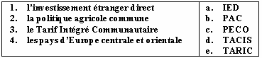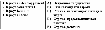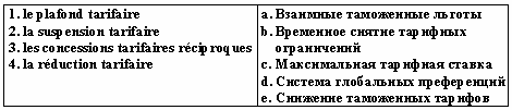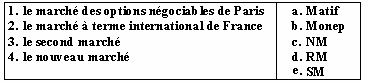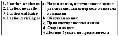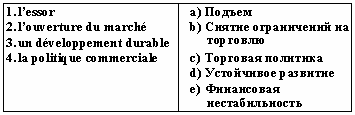 Список вопросов базы знанийФранц. яз. Профессиональный язык для экономистовВопрос id:2308644 Тема/шкала: 0315.06.01;МТ.01;1 - Модульный тест - Франц. яз. Профессиональный язык для экономистов Choisissez le mot correct pour remplir la phrase: Les ___ sont fixées non pas sur une quantité déterminée mais sur une durée limitée ?) suspensions tarifaires ?) droits anti-dumping ?) plafonds tarifaires ?) droits de douane Вопрос id:2308645 Тема/шкала: 0315.06.01;МТ.01;1 - Модульный тест - Франц. яз. Профессиональный язык для экономистов Choisissez le mot correct pour remplir la phrase: ___ est une valeur mesurant la propension d'une valeur mobilière, ou du marché, à varier significativement à la hausse ou à la baisse ?) La maturité ?) La volatilité ?) La cotation ?) La radiation Вопрос id:2308646 Тема/шкала: 0315.06.01;МТ.01;1 - Модульный тест - Франц. яз. Профессиональный язык для экономистов Choisissez le mot correct pour remplir la phrase: ___ du coupon est défini par le taux d'intérêt de l'emprunt ?) La radiation ?) La cotation ?) La maturité ?) Le montant Вопрос id:2308647 Тема/шкала: 0315.06.01;МТ.01;1 - Модульный тест - Франц. яз. Профессиональный язык для экономистов Choisissez le mot correct pour remplir la phrase: Chaque jour, plus de 800 milliards de dollars transitent électroniquement sur le marché ?) financier ?) boursier ?) des capitaux ?) des changes Вопрос id:2308648 Тема/шкала: 0315.06.01;МТ.01;1 - Модульный тест - Франц. яз. Профессиональный язык для экономистов Choisissez le mot correct pour remplir la phrase: Dans un marché ___, la cotation et l’exécution des ordres ont lieu à intervalles de temps réguliers ?) liquide ?) de fixing ?) des changes ?) financier Вопрос id:2308649 Тема/шкала: 0315.06.01;МТ.01;1 - Модульный тест - Франц. яз. Профессиональный язык для экономистов Choisissez le mot correct pour remplir la phrase: La valeur ___ ou valeur faciale est le montant exact de l'argent prêté ?) nominale ?) boursière ?) marchande ?) de remboursement Вопрос id:2308650 Тема/шкала: 0315.06.01;МТ.01;1 - Модульный тест - Франц. яз. Профессиональный язык для экономистов Choisissez le mot correct pour remplir la phrase: Les ___ s'inspirent des contingents tarifaires mais leur limite quantitative est beaucoup moins impérative. ?) droits anti-dumping ?) plafonds tarifaires ?) droits de douane ?) suspensions tarifaires Вопрос id:2308651 Тема/шкала: 0315.06.01;МТ.01;1 - Модульный тест - Франц. яз. Профессиональный язык для экономистов Choisissez le mot correct pour remplir la phrase: Les produits peuvent être frappés de ___ dans le premier cas, de droits de douane supplémentaires dans le cas de subventions à l'exportation ?) suspensions tarifaires ?) droits de douane ?) plafonds tarifaires ?) droits anti-dumping Вопрос id:2308652 Тема/шкала: 0315.06.01;МТ.01;1 - Модульный тест - Франц. яз. Профессиональный язык для экономистов Choisissez le mot correct pour remplir la phrase: Le tarif extérieur commun s'applique à toute marchandise franchissant les frontières ?) terrestres ?) maritimes ?) communautaires ?) intracommunautaires Вопрос id:2308653 Тема/шкала: 0315.06.01;МТ.01;1 - Модульный тест - Франц. яз. Профессиональный язык для экономистов Choisissez le mot correct pour remplir la phrase: Choisir des outils de la politique ______ favorisant le développement à l´heure de la mondialisation de l´économie ?) commerciale ?) communautaire ?) du contrôle ?) pacifique Вопрос id:2308654 Тема/шкала: 0315.06.01;МТ.01;1 - Модульный тест - Франц. яз. Профессиональный язык для экономистов Choisissez le mot correct pour remplir la phrase: L'Etat ___ l'importation de produits agricoles ?) quote ?) contingente ?) continue ?) cote Вопрос id:2308655 Тема/шкала: 0315.06.01;МТ.01;1 - Модульный тест - Франц. яз. Профессиональный язык для экономистов Choisissez le mot correct pour remplir la phrase: La valeur ___ ou principal est le montant que l'emprunteur s'engage à rembourser à échéance ?) boursière ?) de remboursement ?) marchande ?) nominale Вопрос id:2308656 Тема/шкала: 0315.06.01;МТ.01;1 - Модульный тест - Франц. яз. Профессиональный язык для экономистов Choisissez le mot correct pour remplir la phrase: Les actions ___ sont des titres totalement anonymes ?) nominatives ?) au porteur ?) ordinaires ?) anciennes Вопрос id:2308657 Тема/шкала: 0315.06.01;МТ.01;1 - Модульный тест - Франц. яз. Профессиональный язык для экономистов Choisissez le mot correct pour remplir la phrase: Les revenus que constituent les droits ___de produits provenant de pays tiers constitue la principale source financière de l'UE ?) d'entrée ?) anti-dumping ?) de courtage ?) de vote Вопрос id:2308658 Тема/шкала: 0315.06.01;МТ.01;1 - Модульный тест - Франц. яз. Профессиональный язык для экономистов Choisissez le mot correct pour remplir la phrase: Par le Bulletin ___, la SBF assu