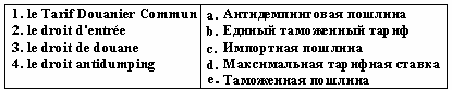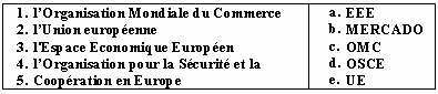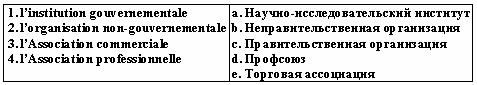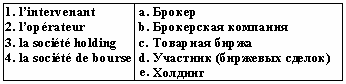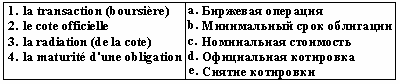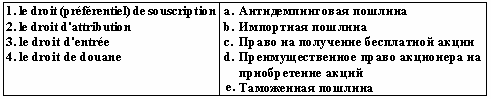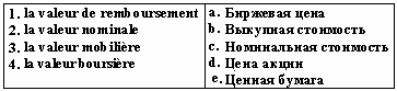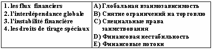 Список вопросов базы знанийФранц. яз. Профессиональный язык для экономистовВопрос id:2308694 Тема/шкала: 0315.06.01;МТ.01;1 - Модульный тест - Франц. яз. Профессиональный язык для экономистов Reliez les йquivalents ![]() ?) 1-a, 2-e, 3-b, 4-c ?) 1-b, 2-c, 3-e, 4-a ?) 1-e, 2-d, 3-b, 4-a ?) 1-e, 2-d, 3-b, 4-c Вопрос id:2308695 Тема/шкала: 0315.06.01;МТ.01;1 - Модульный тест - Франц. яз. Профессиональный язык для экономистов Reliez les йquivalents ![]() ?) 1-e, 2-d, 3-a, 4-b ?) 1-a, 2-d, 3-b, 4-e ?) 1-b, 2-d, 3-a, 4-c ?) 1-c, 2-e, 3-b, 4-a Вопрос id:2308696 Тема/шкала: 0315.06.01;МТ.01;1 - Модульный тест - Франц. яз. Профессиональный язык для экономистов Reliez les йquivalents ![]() ?) 1-e, 2-b, 3-d, 4-a ?) 1-a, 2-e, 3-b, 4-c ?) 1-b, 2-c, 3-e, 4-a ?) 1-a, 2-b, 3-d, 4-c Вопрос id:2308697 Тема/шкала: 0315.06.01;МТ.01;1 - Модульный тест - Франц. яз. Профессиональный язык для экономистов Reliez les йquivalents ![]() ?) 1-d, 2-c, 3-b, 4-a ?) 1-a, 2-e, 3-b, 4-d ?) 1-d, 2-e, 3-b, 4-a ?) 1-b, 2-d, 3-a, 4-c Вопрос id:2308698 Тема/шкала: 0315.06.01;МТ.01;1 - Модульный тест - Франц. яз. Профессиональный язык для экономистов Reliez les йquivalents ![]() ?) 1-a, 2-d, 3-b, 4-c ?) 1-c, 2-e, 3-b, 4-d ?) 1-b, 2-e, 3-c, 4-a ?) 1-a, 2-d, 3-e, 4-b Вопрос id:2308699 Тема/шкала: 0315.06.01;МТ.01;1 - Модульный тест - Франц. яз. Профессиональный язык для экономистов Reliez les йquivalents ![]() ?) 1-a, 2-b, 3-e, 4-d ?) 1-d, 2-b, 3-e, 4-a ?) 1-a, 2-c, 3-b, 4-d ?) 1-e, 2-a, 3-d, 4-c Вопрос id:2308700 Тема/шкала: 0315.06.01;МТ.01;1 - Модульный тест - Франц. яз. Профессиональный язык для экономистов Reliez les йquivalents ![]() ?) 1-a, 2-e, 3-c, 4-d ?) 1-d, 2-a, 3-e, 4-b ?) 1-bv, 2-e, 3-d, 4-a ?) 1-d, 2-e, 3-b, 4-a Вопрос id:2308701 Тема/шкала: 0315.06.01;МТ.01;1 - Модульный тест - Франц. яз. Профессиональный язык для экономистов Reliez les йquivalents ![]() ?) 1-c, 2-e, 3-b, 4-d ?) 1-e, 2-a, 3-d, 4-b ?) 1-c, 2-b, 3-e, 4-d ?) 1-d, 2-b, 3-c, 4-e Вопрос id:2308702 Тема/шкала: 0315.06.01;МТ.01;1 - Модульный тест - Франц. яз. Профессиональный язык для экономистов Reliez les йquivalents ![]() ?) 1-c, 2-b, 3-a, 4-d ?) 1-b, 2-a, 3-e, 4-c ?) 1-d, 2-e, 3-b, 4-c ?) 1-a, 2-b, 3-c, 4-d Вопрос id:2308703 Тема/шкала: 0315.06.01;МТ.01;1 - Модульный тест - Франц. яз. Профессиональный язык для экономистов Reliez les йquivalents ![]() ?) 1-b, 2-c, 3-e, 4-d ?) 1-a, 2-e, 3-b, 4-d ?) 1-d, 2-b, 3-e, 4-a ?) 1-c, 2-e, 3-a, 4-d Вопрос id:2308704 Тема/шкала: 0315.06.01;МТ.01;1 - Модульный тест - Франц. яз. Профессиональный язык для экономистов Reliez les йquivalents ![]() ?) 1-d, 2-e, 3-a, 4-b ?) 1-c, 2-b, 3-a, 4-d ?) 1-d, 2-c, 3-b, 4-e ?) 1-c, 2-a, 3-b, 4-d Вопрос id:2308705 Тема/шкала: 0315.06.01;МТ.01;1 - Модульный тест - Франц. яз. Профессиональный язык для экономистов Reliez les йquivalents ![]() ?) 1-e, 2-a, 3-d, 4-c ?) 1-d, 2-e, 3-b, 4-a ?) 1-e, 2-c, 3-b, 4-a ?) 1-a, 2-e, 3-c, 4-d Вопрос id:2308706 Тема/шкала: 0315.06.01;МТ.01;1 - Модульный тест - Франц. яз. Профессиональный язык для экономистов Trouvez le synonyme: valeur nominale ?) valeur faciale ?) valeur mobilière ?) valeur boursière ?) valeur de remboursement Вопрос id:2308707 Тема/шкала: 0315.06.01;МТ.01;1 - Модульный тест - Франц. яз. Профессиональный язык для экономистов Trouvez le synonyme: valeur mobilière ?) titre ?) action ?) créance ?) obligation Вопрос id:2308708 Тема/шкала: 0315.06.01;МТ.01;1 - Модульный тест - Франц. яз. Профессиональный язык для экономистов Trouvez le synonyme: marché des changes ?) marché des capitaux ?) marché monetaire ?) marché boursier ?) marché financier Вопрос id:2308709 Тема/шкала: 0315.06.01;МТ.01;1 - Модульный тест - Франц. яз. Профессиональный язык для экономистов Choisissez le mot correct pour remplir la phrase: A cet égard, l'Union Européenne applique à certaines importations des mesures de ?) taux ?) contrôle ?) réglement ?) taxation Вопрос id:2308710 Тема/шкала: 0315.06.01;МТ.01;1 - Модульный тест - Франц. яз. Профессиональный язык для экономистов Choisissez le mot correct pour remplir la phrase: Durant l'exercice 2001, ___ a intensifié ses efforts pour aider les pays pauvres ?) l’organisation mondiale du commerce ?) la Banque mondiale ?) la Banque de France ?) l’Union Européenne Вопрос id:2308711 Тема/шкала: 0315.06.01;МТ.01;1 - Модульный тест - Франц. яз. Профессиональный язык для экономистов Choisissez le mot correct pour remplir la phrase: Elle a également conclu des accords avec différents pays ou groupes de pays sous la forme ___ ou de régimes tarifaires préférentiels ?) d’unions douanières ?) de plafonds tarifaires ?) de prélèvements d’entrée ?) d'accords de libre-écha