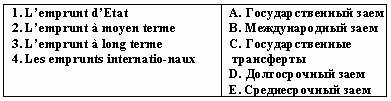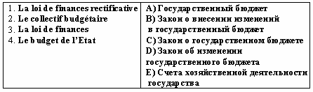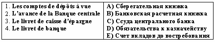 Список вопросов базы знанийФранц. яз. Профессиональный язык для экономистовВопрос id:2308744 Тема/шкала: 0315.02.01;МТ.01;1 - Модульный тест - Франц. яз. Профессиональный язык для экономистов Choisissez le mot correct pour remplir la phrase : ___correspondent à la création monétaire destinée à financer les besoins de l'Etat. ?) Les obligations ?) Les crédits bancaires ?) Les créances sur le Trésor public ?) Les livrets d’épargne Вопрос id:2308745 Тема/шкала: 0315.02.01;МТ.01;1 - Модульный тест - Франц. яз. Профессиональный язык для экономистов Choisissez le mot correct pour remplir la phrase : ___ est une décision des autorités monétaires consistant à diminuer la valeur de la monnaie nationale par rapport à un étalon de référence ?) L’apréciation ?) La dépréciation ?) La dévaluation ?) La révaluation Вопрос id:2308746 Тема/шкала: 0315.02.01;МТ.01;1 - Модульный тест - Франц. яз. Профессиональный язык для экономистов Choisissez le mot correct pour remplir la phrase : Le ___ est né en 1979 pour assurer une meilleure stabilité aux monnaies européennes face aux désordres monétaires internationaux ?) FMI ?) SMI ?) BM ?) SME Вопрос id:2308747 Тема/шкала: 0315.02.01;МТ.01;1 - Модульный тест - Франц. яз. Профессиональный язык для экономистов Choisissez le mot correct pour remplir la phrase : ___ se présente sous la forme d'un morceau de métal dont le poids et la valeur sont attestés par un poinçon, frappé par la puissance politique ?) La monnaie-marchandise ?) La monnaie métallique ?) La monnaie scripturale ?) La monnaie dévisionnaire Вопрос id:2308748 Тема/шкала: 0315.02.01;МТ.01;1 - Модульный тест - Франц. яз. Профессиональный язык для экономистов Choisissez le mot correct pour remplir la phrase : Depuis 1967, les banques sont tenues de conserver dans un compte à la Banque de France, sous forme de dépôts non rémunérés, un montant minimum de réserves dont le montant est aujourd'hui proportionnel aux ?) dépôts bancaires ?) livrets d’épargne ?) livrets bancaires ?) crédits bancaires Вопрос id:2308749 Тема/шкала: 0315.02.01;МТ.01;1 - Модульный тест - Франц. яз. Профессиональный язык для экономистов Choisissez le mot correct pour remplir la phrase : ___ est généralement fixé par référence au taux directeur au niveau international qui est le LIBOR (London Interbank Offered Rate) auquel s’ajoute une marge destinée à tenir compte du risque de non-remboursement ?) La contrpartie monnétaire ?) Le taux de change ?) Le cours pivot ?) Le taux d’intérêt Вопрос id:2308750 Тема/шкала: 0315.02.01;МТ.01;1 - Модульный тест - Франц. яз. Профессиональный язык для экономистов Choisissez le mot correct pour remplir la phrase : ___ représente l'ensemble des créances qui ont permis la création monétaire pendant une période ?) L’émission monétaire ?) La masse monétaire ?) La contrepartie de la monnaie ?) La monnaie métallique Вопрос id:2308751 Тема/шкала: 0315.02.01;МТ.01;1 - Модульный тест - Франц. яз. Профессиональный язык для экономистов Choisissez le mot correct pour remplir la phrase : Des contrôles ___ sont également effectués, sur le plan administratif par l'Inspection Générale des Finances, sur le plan juridictionnel par la Cour des Comptes et sur le plan parlementaire par des Commissions parlementaires ?) a posteriori ?) a priori ?) prima facie ?) recto verso Вопрос id:2308752 Тема/шкала: 0315.02.01;МТ.01;1 - Модульный тест - Франц. яз. Профессиональный язык для экономистов Choisissez le mot correct pour remplir la phrase : ___ comprend les mesures réglementaires visant à limiter la progression des crédits à l'économie ?) La restructuration du crédit ?) Le versement du crédit ?) Le rééchélonnement du crédit ?) L’encadrement du crédit Вопрос id:2308753 Тема/шкала: 0315.02.01;МТ.01;1 - Модульный тест - Франц. яз. Профессиональный язык для экономистов Choisissez le mot correct pour remplir la phrase : ___sont des prêts accordés par les banques à des États du tiers monde ou à des entreprises de ces pays ?) Les bons de trésor ?) Les crédits bancaires ?) Les prêts bancaires ?) Les avances de la Banque de France Вопрос id:2308754 Тема/шкала: 0315.02.01;МТ.01;1 - Модульный тест - Франц. яз. Профессиональный язык для экономистов Choisissez le mot correct pour remplir la phrase : ___ est l’ensemble des emprunts contractés par des emprunteurs privés quel que soit le prêteur ?) Dette de l’Etat ?) Dette personnelle ?) Dette privée ?) Dette publiques Вопрос id:2308755 Тема/шкала: 0315.02.01;МТ.01;1 - Модульный тест - Франц. яз. Профессиональный язык для экономистов Choisissez le mot correct pour remplir la phrase : Dans le système français de___ , l'agent économique prend le nom d'unité institutionnelle, cette unité statistique de base étant définie avant tout par son statut juridique ?) comptabilité nationale ?) système financier ?) audit national ?) système bancaire Вопрос id:2308756 Тема/шкала: 0315.02.01;МТ.01;1 - Модульный тест - Франц. яз. Профессионал