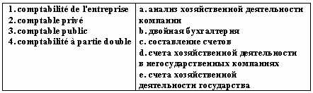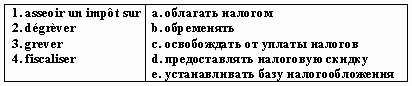 Список вопросов базы знанийФранц.яз. (профессиональный для направления `Экономика`)Вопрос id:2315308 Тема/шкала: 0315.05.01;МТ.01;1 - Модульный тест - Франц.яз. (профессиональный для направления `Экономика`) Trouvez le synonyme : exonération (d'impôt) ?) majoration (d'impôt) ?) exemption (d'impôt) ?) liquidation (d'impôt) ?) alourdissement (d'impôt) Вопрос id:2315309 Тема/шкала: 0315.05.01;МТ.01;1 - Модульный тест - Франц.яз. (профессиональный для направления `Экономика`) Reliez les йquivalents : ![]() ?) 1-c, 2-e, 3-b, 4-a ?) 1-d, 2-e, 3-c, 4-a ?) 1-a, 2-d, 3-e, 4-b ?) 1-b, 2-d, 3-e, 4-a Вопрос id:2315310 Тема/шкала: 0315.05.01;МТ.01;1 - Модульный тест - Франц.яз. (профессиональный для направления `Экономика`) Reliez les йquivalents : ![]() ?) 1-e, 2-d, 3-a, 4-a ?) 1-b, 2-d, 3-e, 4-a ?) 1-d, 2-e, 3-a, 4-c ?) 1-d, 2-e, 3-a, 4-b Вопрос id:2315311 Тема/шкала: 0315.05.01;МТ.01;1 - Модульный тест - Франц.яз. (профессиональный для направления `Экономика`) Reliez les йquivalents : ![]() ?) 1-a, 2-e, 3-d, 4-c ?) 1-c, 2-e, 3-a, 4-b ?) 1-e, 2-a, 3-c, 4-b ?) 1-d, 2-b, 3-e, 4-a Вопрос id:2315312 Тема/шкала: 0315.05.01;МТ.01;1 - Модульный тест - Франц.яз. (профессиональный для направления `Экономика`) Reliez les йquivalents : ![]() ?) 1-a, 2-b, 3-d, 4-e ?) 1-e, 2-c, 3-d, 4-a ?) 1-c, 2-d, 3-a, 4-e ?) 1-e, 2-c, 3-b, 4-a Вопрос id:2315313 Тема/шкала: 0315.05.01;МТ.01;1 - Модульный тест - Франц.яз. (профессиональный для направления `Экономика`) Choisissez le mot correct pour remplir la phrase : Cela fait la troisième année que cette entreprise est dans le ?) bleu ?) vert ?) noir ?) rouge Вопрос id:2315314 Тема/шкала: 0315.05.01;МТ.01;1 - Модульный тест - Франц.яз. (профессиональный для направления `Экономика`) Choisissez le mot correct pour remplir la phrase : Conformément à la mission ___ et de certification relative au Site de Commerce Electronique de votre société, nous avons procédé aux contrôles nécessaires, détaillés en annexe 1 ?) d’imposition ?) de budgétisation ?) de taxation ?) d'audit Вопрос id:2315315 Тема/шкала: 0315.05.01;МТ.01;1 - Модульный тест - Франц.яз. (профессиональный для направления `Экономика`) Choisissez le mot correct pour remplir la phrase : D'une année à l'autre, nos résultats se sont détériorés, ___ et le bénéfice ont nettement baissé ?) la valeur ajoutée ?) le chiffre d'affaires ?) les impôts ?) le survaloir Вопрос id:2315316 Тема/шкала: 0315.05.01;МТ.01;1 - Модульный тест - Франц.яз. (профессиональный для направления `Экономика`) Choisissez le mot correct pour remplir la phrase : Dans les revenus ___ on peut citer trois exemples: les bénéfices industriels et commerciaux, les bénéfices non commerciaux et les bénéfices agricoles ?) des capitaux ?) immobilier ?) du travail ?) mixtes Вопрос id:2315317 Тема/шкала: 0315.05.01;МТ.01;1 - Модульный тест - Франц.яз. (профессиональный для направления `Экономика`) Choisissez le mot correct pour remplir la phrase : J'aimerais savoir si je suis ___ de l'impôt sur le revenu ?) détaxable ?) redevable ?) déclaré ?) dégrevable Вопрос id:2315318 Тема/шкала: 0315.05.01;МТ.01;1 - Модульный тест - Франц.яз. (профессиональный для направления `Экономика`) Choisissez le mot correct pour remplir la phrase : L'actif ___ recense les biens pouvant servir durablement à l'entreprise ?) circulant ?) corporel ?) immobilisé ?) incorporel Вопрос id:2315319 Тема/шкала: 0315.05.01;МТ.01;1 - Модульный тест - Франц.яз. (профессиональный для направления `Экономика`) Choisissez le mot correct pour remplir la phrase : L'administration lui a infligé ___ de 90 000 F car il n'a pas rempli de déclaration de revenus ni reversé la TVA qu'il percevait ?) un crédit fiscal ?) un redressement fiscal ?) une majoration ?) une liquidation fiscale Вопрос id:2315320 Тема/шкала: 0315.05.01;МТ.01;1 - Модульный тест - Франц.яз. (профессиональный для направления `Экономика`) Choisissez le mot correct pour remplir la phrase : La CSG est prélevée ___ source sur tous les revenus: au taux de 2,4% au l-er juillet 1993, elle sert à financer la Sécurité sociale ?) sur la ?) à la ?) pour la ?) près de Вопрос id:2315321 Тема/шкала: 0315.05.01;МТ.01;1 - Модульный тест - Франц.яз. (профессиональный для направления `Экономика`) Choisissez le mot correct pour remplir la phrase : La loi prévoit des régimes ___ : par exemple, pour favoriser la création d'entreprises nouvelles, elle n'impose pas les bénéfices réalisés pendant une certaine période ?) d'incitations fiscales ?) de dégrevement fiscal ?) d’indications fiscales ?) de franchise fiscale Вопрос id:2315322 Тема/шкала: 0315.05.01;МТ.01;1 - Модульный тест - Франц.яз. (профессиональный для направления `Экономика`) Choisissez le mot correct pour remplir la phrase : La valeur vénale des bi