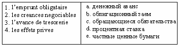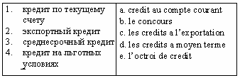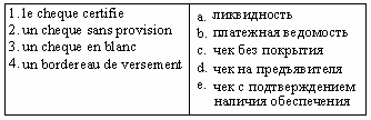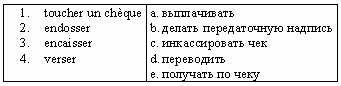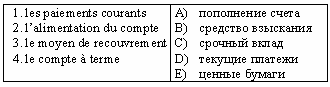 Список вопросов базы знанийФранц.яз. (профессиональный для направления `Экономика`)Вопрос id:2315358 Тема/шкала: 0315.03.01;МТ.01;1 - Модульный тест - Франц.яз. (профессиональный для направления `Экономика`) Choisissez le mot correct pour remplir la phrase : Dans le cas du compte ___, le client ne pourra retirer les fonds qu'en respectant un délai de préavis préalablement fixé avec le banquier ?) d’épargne-logement ?) à vue ?) courant ?) à préavis Вопрос id:2315359 Тема/шкала: 0315.03.01;МТ.01;1 - Модульный тест - Франц.яз. (профессиональный для направления `Экономика`) Choisissez le mot correct pour remplir la phrase : Dans le cas des paiements ___, le transfert des fonds d'un compte sur un autre s'effectue par un jeu d'écritures ?) en titres ?) en argents liquide ?) en lettres de créence ?) scripturaux Вопрос id:2315360 Тема/шкала: 0315.03.01;МТ.01;1 - Модульный тест - Франц.яз. (профессиональный для направления `Экономика`) Choisissez le mot correct pour remplir la phrase : En France, ______ ne sont pas endossables sauf au profit d'un établissement bancaire ou assimilé ?) les bons de caisse ?) les lettres de crédits ?) les billets de banque ?) les chèques Вопрос id:2315361 Тема/шкала: 0315.03.01;МТ.01;1 - Модульный тест - Франц.яз. (профессиональный для направления `Экономика`) Choisissez le mot correct pour remplir la phrase : En France, ___ont surtout une clientèle de PME, d'artisans et de particuliers ?) les banques populaires ?) les sociétés financières ?) les banques d'affaires ?) les banques commerciales Вопрос id:2315362 Тема/шкала: 0315.03.01;МТ.01;1 - Модульный тест - Франц.яз. (профессиональный для направления `Экономика`) Choisissez le mot correct pour remplir la phrase : En tant que___, la Banque de France est institut d'émission et contrôle le volume de la monnaie et du crédit ?) caisse d'épargne ?) banque centrale ?) banque populaire ?) banque commerciale Вопрос id:2315363 Тема/шкала: 0315.03.01;МТ.01;1 - Модульный тест - Франц.яз. (профессиональный для направления `Экономика`) Choisissez le mot correct pour remplir la phrase : L'endossement ___ ne comporte que la signature de l'endosseur ?) complet ?) au recto ?) au verso ?) en blanc Вопрос id:2315364 Тема/шкала: 0315.03.01;МТ.01;1 - Модульный тест - Франц.яз. (профессиональный для направления `Экономика`) Choisissez le mot correct pour remplir la phrase : La banque centrale a le monopole d'émission des ?) billets de banque ?) les emprunts obligataires ?) les valeurs mobillieres ?) les pièces de monnaie Вопрос id:2315365 Тема/шкала: 0315.03.01;МТ.01;1 - Модульный тест - Франц.яз. (профессиональный для направления `Экономика`) Choisissez le mot correct pour remplir la phrase : La Banque de France dispose actuellement de deux instruments pour sa politique monétaire: ___ sur le marché interbancaire et les réserves obligatoires ?) les redressements ?) les positions ?) les interventions ?) les réfinancements Вопрос id:2315366 Тема/шкала: 0315.03.01;МТ.01;1 - Модульный тест - Франц.яз. (профессиональный для направления `Экономика`) Choisissez le mot correct pour remplir la phrase : La Banque de France publie son (sa)___ le vendredi de chaque semaine ?) relévé ?) situation ?) position ?) redressement Вопрос id:2315367 Тема/шкала: 0315.03.01;МТ.01;1 - Модульный тест - Франц.яз. (профессиональный для направления `Экономика`) Choisissez le mot correct pour remplir la phrase : La négociation d'effets auprès d'une banque permet d'obtenir des crédits ?) à court terme ?) à moyen terme ?) à long terme ?) à l’exportation Вопрос id:2315368 Тема/шкала: 0315.03.01;МТ.01;1 - Модульный тест - Франц.яз. (профессиональный для направления `Экономика`) Choisissez le mot correct pour remplir la phrase : Le client peut louer une case de ___ pour y déposer des objets précieux, des papiers importants, etc. ?) succursale ?) banque ?) guichet ?) coffre-fort Вопрос id:2315369 Тема/шкала: 0315.03.01;МТ.01;1 - Модульный тест - Франц.яз. (профессиональный для направления `Экономика`) Choisissez le mot correct pour remplir la phrase : Le ___est une moyenne journalière des taux consentis par les principales banques de la place de Paris sur le marché monétaire ?) TIOP ?) CB ?) TIG ?) PME Вопрос id:2315370 Тема/шкала: 0315.03.01;МТ.01;1 - Модульный тест - Франц.яз. (профессиональный для направления `Экономика`) Choisissez le mot correct pour remplir la phrase : Les guichets de notre banque vous conseilleront sur les meilleurs ?) virements ?) placements ?) investissements ?) alimentations Вопрос id:2315371 Тема/шкала: 0315.03.01;МТ.01;1 - Модульный тест - Франц.яз. (профессиональный для направления `Экономика`) Choisissez le mot correct pour remplir la phrase : Pour se procurer des billets de banque, les banques commerciales vont céder à la banque centrale une partie de leurs créances en échange de