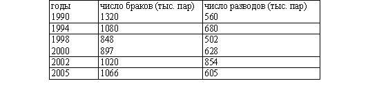 На основании данных таблицы можно сделать вывод, что ?) смертность населения России за 1989 - 2002 гг. значительно сократилась ?) увеличение численности населения России обеспечивалось за счет роста рождаемости ?) миграция населения из-за пределов России позволяла снизить убыль населения ?) в течение последнего десятилетия XX века населения России численно возросло Вопрос id:2320065 Тема/шкала: 8109.01.01;МТ.01;1 - Модульный тест - Обществознание. ЕГЭ. Повышние квалификации Приведенная ниже таблица отражает количество браков и разводов в России по данным Федеральной службы государственной статистики РФ